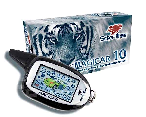 (CAN, дальность туда обратно до 2 км, турботаймер., свободные руки, новый алгоритм кодирования, синхронизатор брелоков, усовершенствованная функция исправления ошибок)Автомобильная охранная система с двусторонней связью SCHER-KHAN MAGICAR 10SCHER-KHAN MAGICAR 10 имеет уникальную возможность подключения к CAN-шине автомобиля. Это происходит благодаря встроенному адаптеру цифровой CAN-шины автомобиля в процессорный блок системы.Адаптер необходим для быстрой и правильной установки сигнализации на автомобили, которые оборудованы кузовными шинами CAN BUS.Применение современных решений в системе SCHER-KHAN MAGICAR 10 упрощает сложную процедуру её монтажа на автомобиль: количество соединительных проводов сведено к Pin Up установить сигнализацию можно в самых труднодоступных участках автомобиля.Еще одно достоинство SCHER-KHAN MAGICAR 10 -рекордная дальность действия (до 2 км), высокая стабильность связи, превосходная помехоустойчивость.